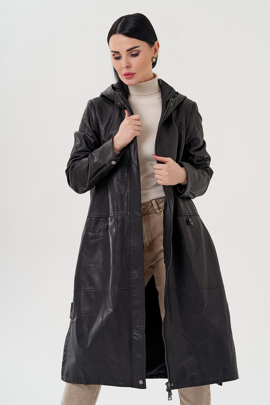 Длинный кожаный плащ с капюшоном