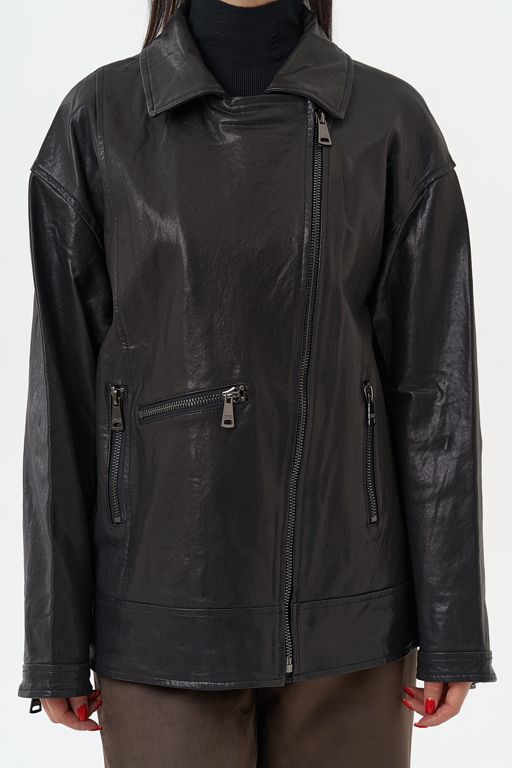 Женская косуха из натуральной кожи в черном цвете - универсальная модель, которая не сдает позиций с 1970-го года! В этом сезоне в трендовом оверсайз- фасоне. Он подойдет всем типам фигуры и будет хорошо смотреться с любым образом, а если вы хотите выделиться, то наденьте ее с легким платьем. Косуха дополнена отложным воротником и молнией. Если вы ищете куртку, которая будет вне времени и будет сочетается с любой одеждой, то это то, что вы искали.