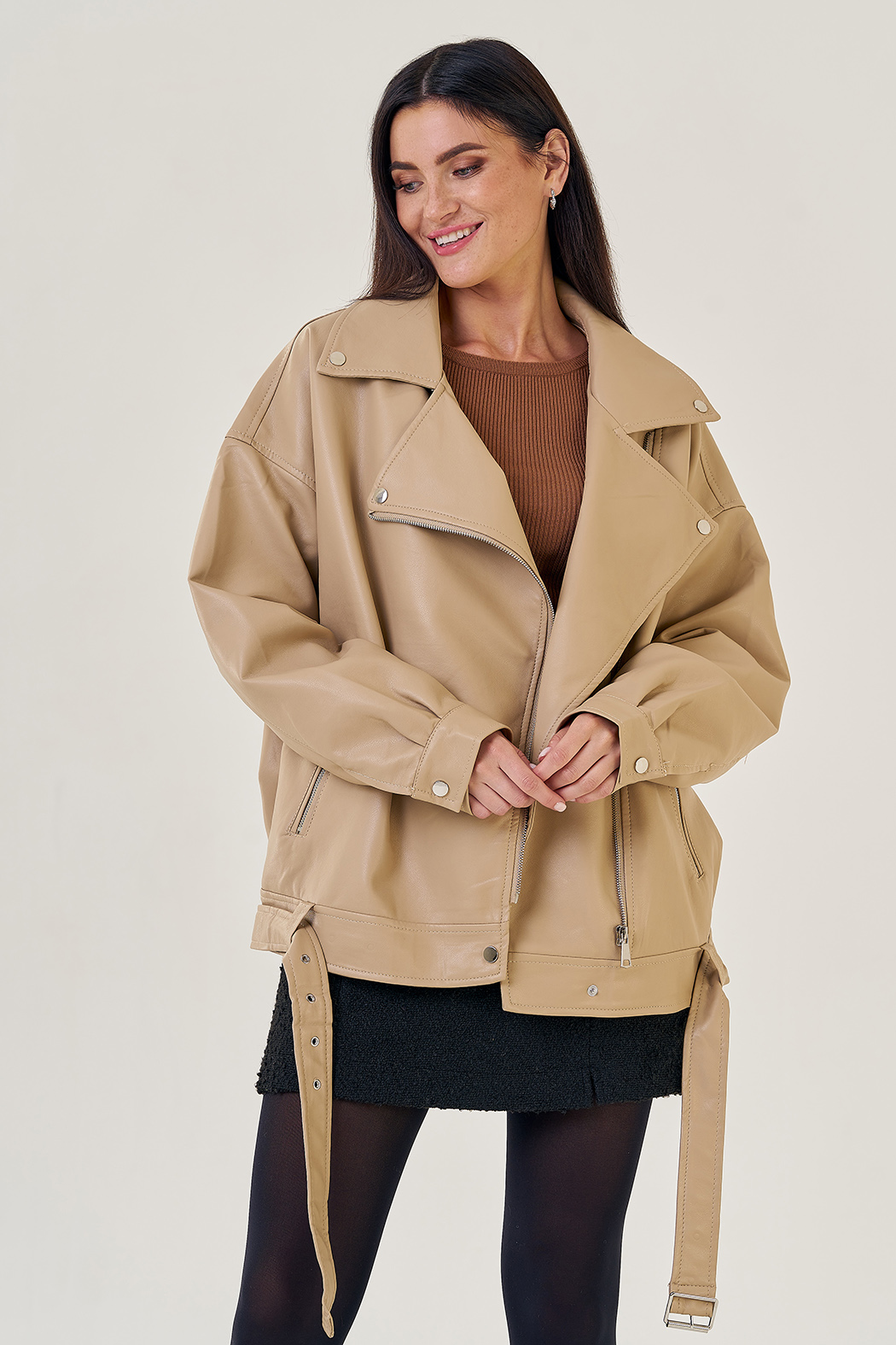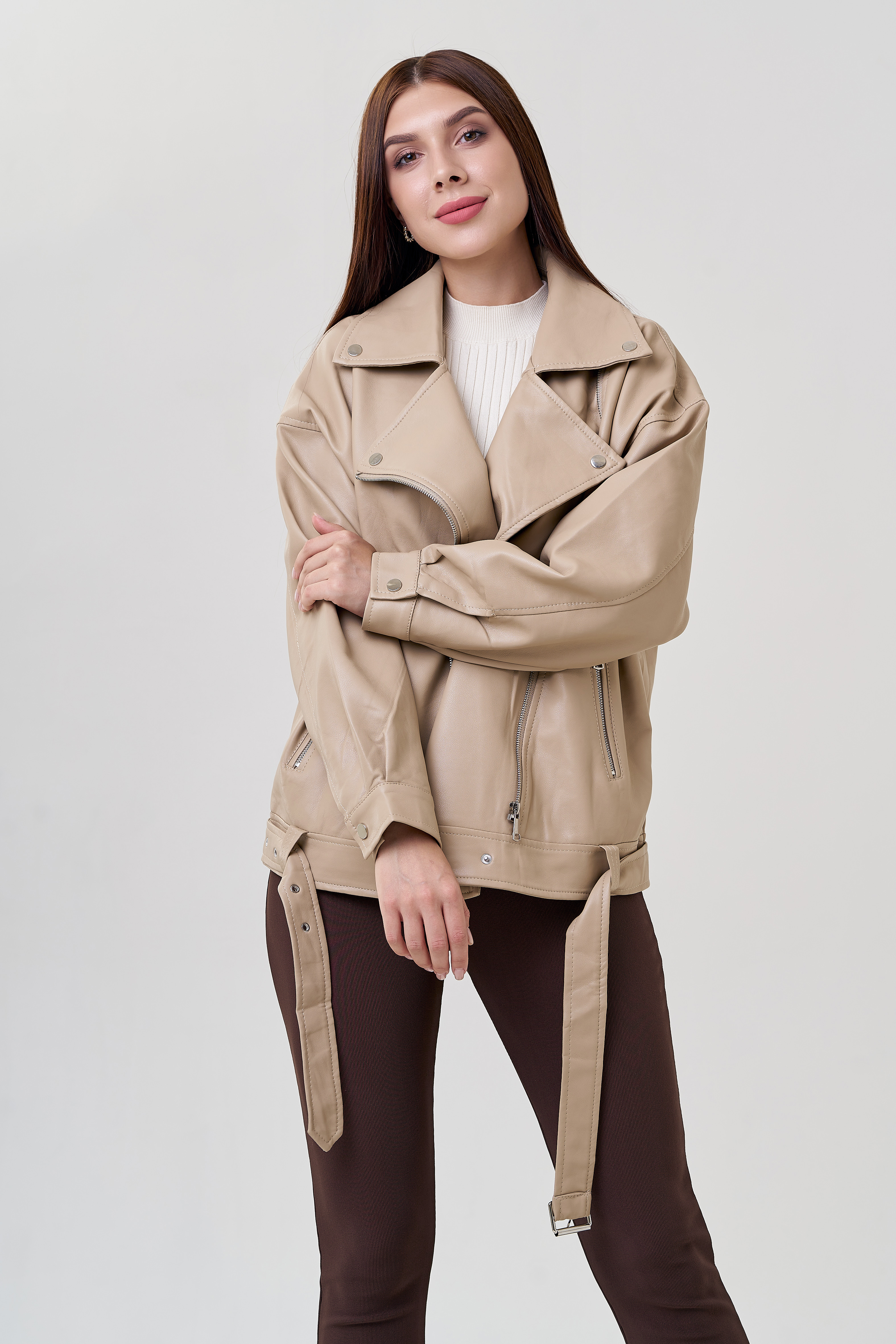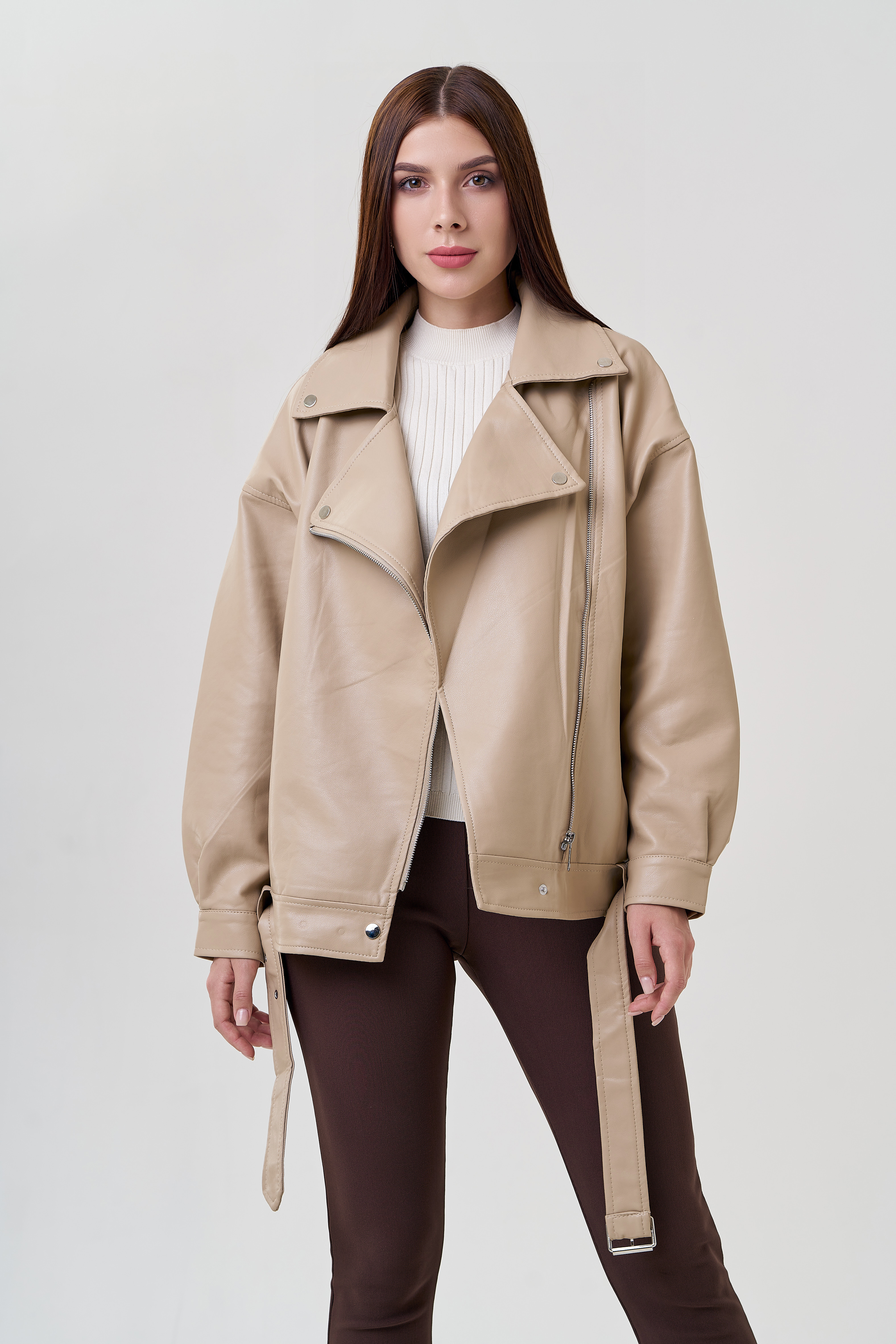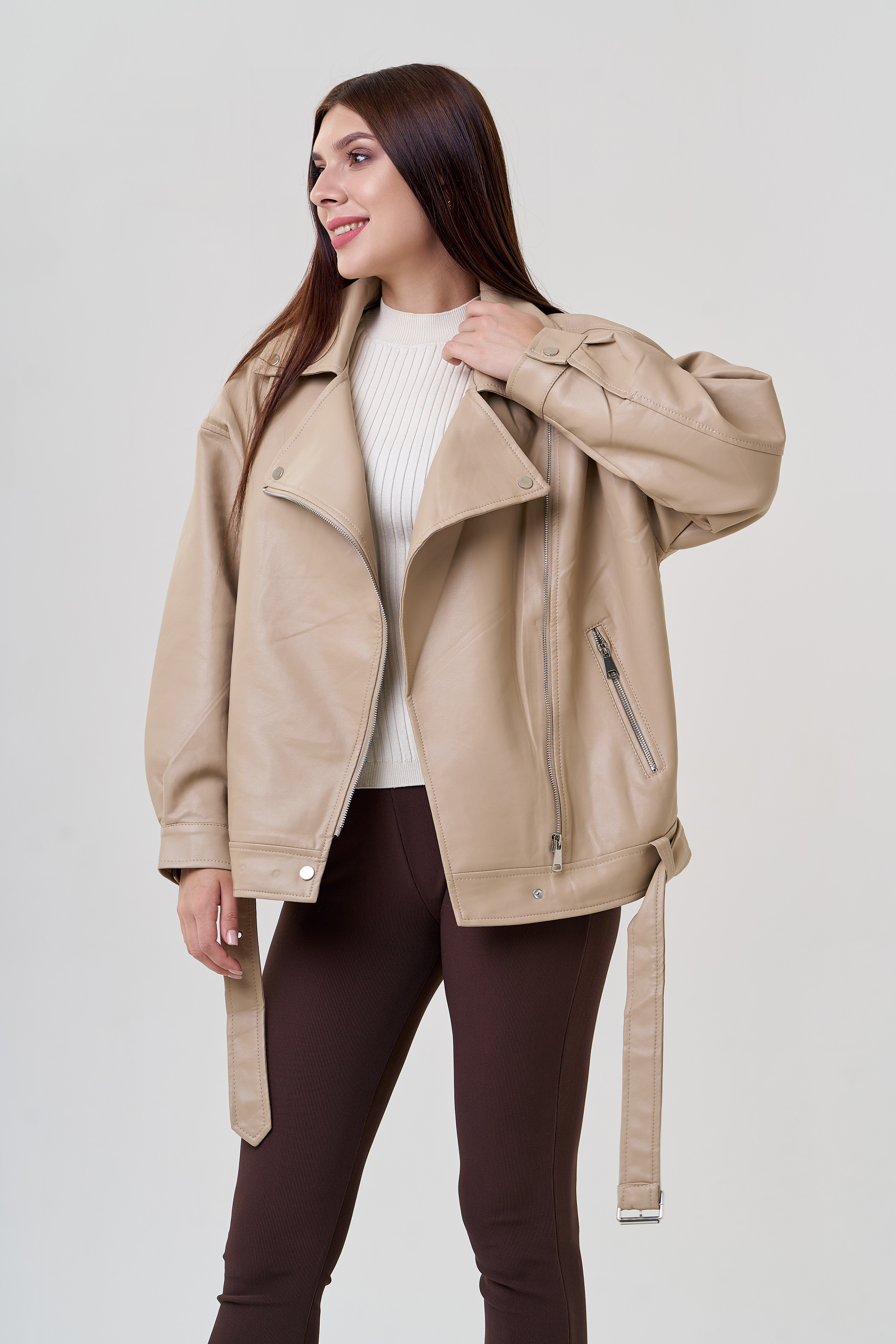 Бежевая куртка в стиле оверсайз точно попадет вам в сердце! Светло-бежевый цвет позволит подбирать к куртке разные образы. Материал эко кожи устойчив к холодам и повреждениям. Модель застегивается на молнию и кнопки. Имеется ремень и карманы на молнии. Рукава с манжетами на кнопках. Фасон оверсайз и спущенные плечи добавят комфорт.