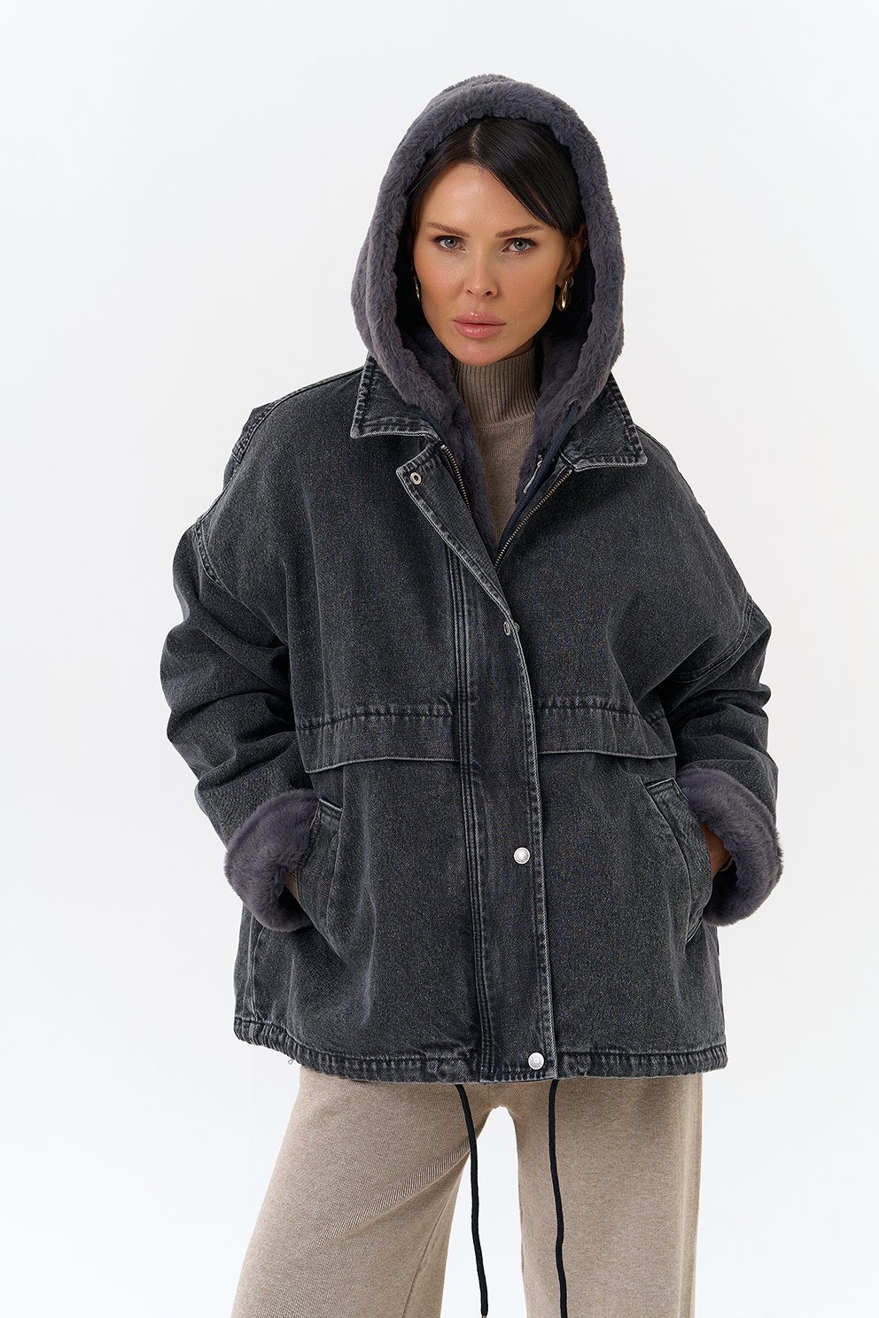 Крой воротника - съемный капюшон, отделка эко мех